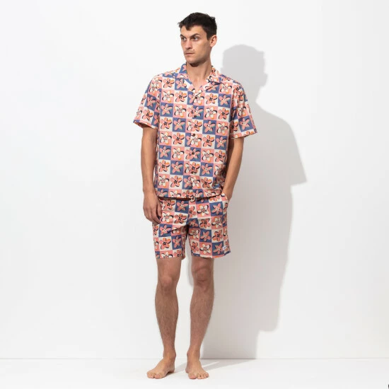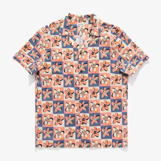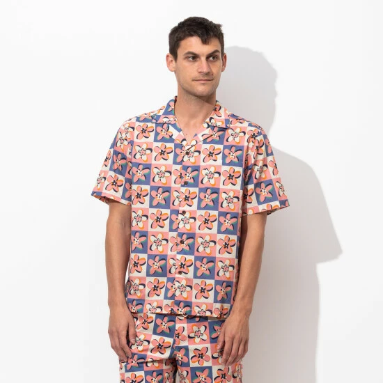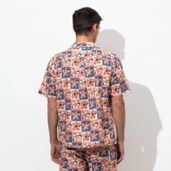 – Camp collar- All over print- Chest pocket- Straight hem- Recycled polyester woven labels- FSC® approved paper swing tags