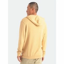 Fit: standard fleece hoodDetails: solid dyed and garment washed, hooded, ribbed at cuffs and hem, contrast twill front pocket, recycled polyester woven labels.Model is: height 6’0”, chest 40”, waist 31” size: medium & 32″