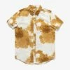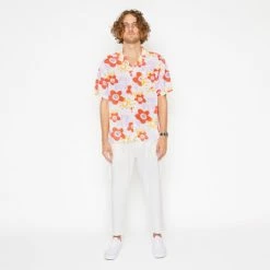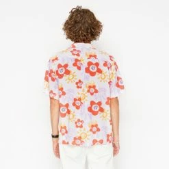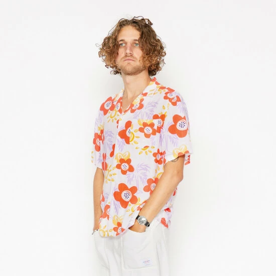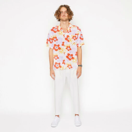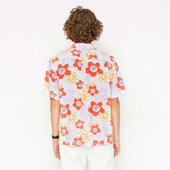 – Camp collar- All over print- Chest pocket- CentStraight hem- Recycled polyester woven labels- FSC® approved paper swing tags