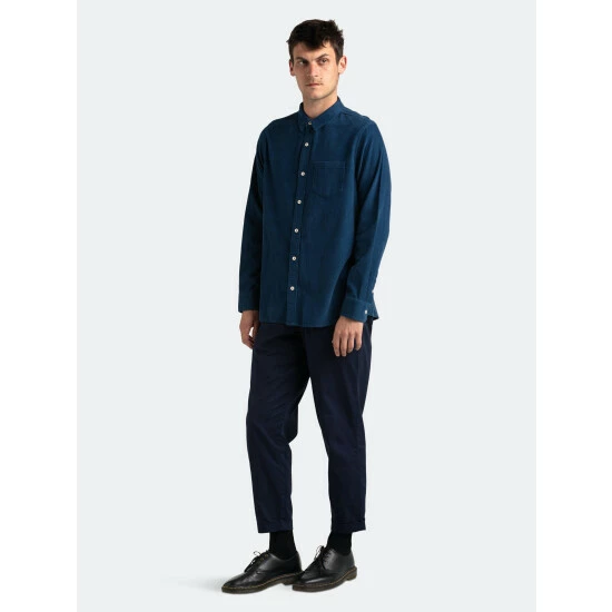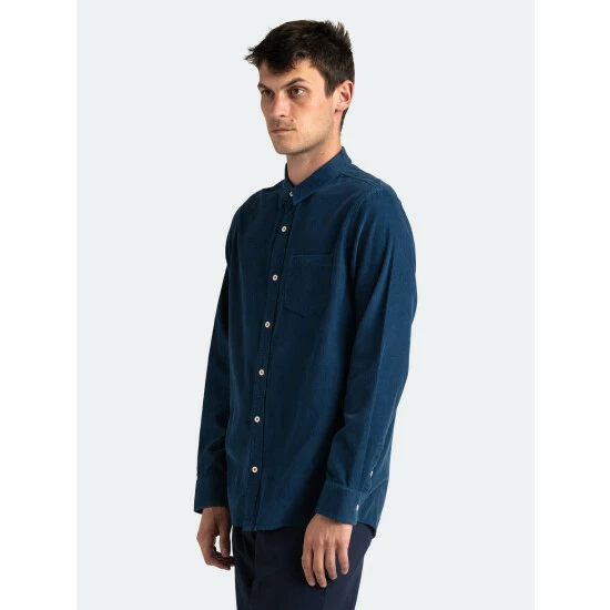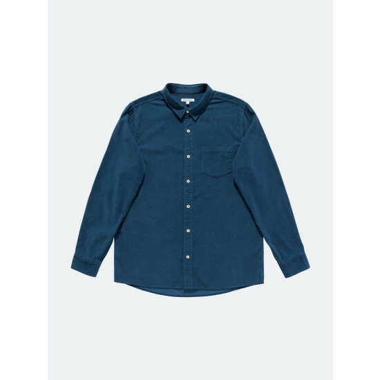 Corduroy fabric, Standard fit collar, Contrast buttons, Curved hem, Chest pocket, Recycled polyester woven labels, FSC® approved paper swing tags